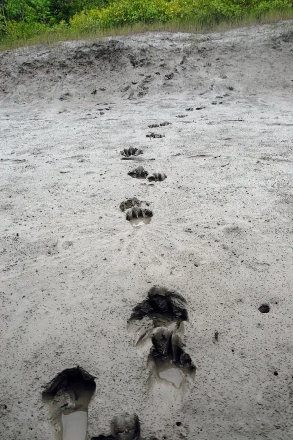 The tigers remained elusive. One morning, we followed fresh pugmarks—distinct footprints in the mud—that led us to the edge of a stream. There, we saw where a tiger had just crossed. We asked how fresh the paw marks were and our guide told us just minutes old. The proximity was both thrilling and frightening; we were so close.