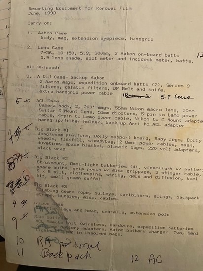 This above list – one of dozens – is a glance at how we tried to prepare for the unknown. Stained and probably re-written three times, it tracks just a sliver of what we hauled: cameras with backup cameras, lenses, power cables, snakebites kits, spare batteries for the spare batteries.