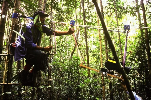 We tried to visualize this somehow on camera – quietly, respectfully – by rigging our camera into the trees, building a kind of low-budget sky rail using ropes and pulleys. We aimed to drift the lens forward, dreamlike, down a trail. The shot was bumpy and improvised, the jungle version of a steadicam on a prayer. But it made it into the film. Something about it worked.