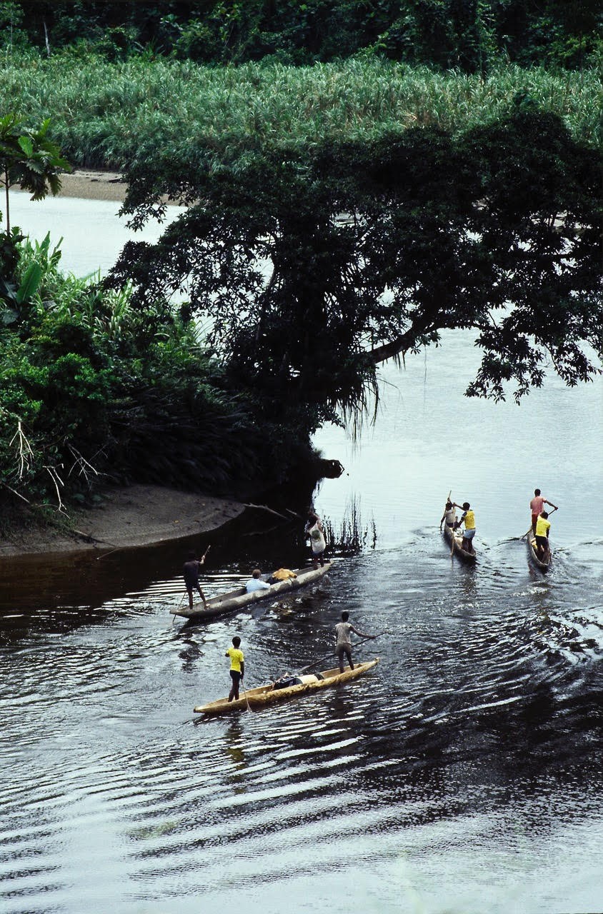We pushed off at first light – local pilots, porters, crew, a scientist with his assistants, and a live chicken. Dugout canoes were packed with gear, including a fifty-kilo bag of rice. And we headed up the Darum Kaibur River. Text me if you can find it on a map.